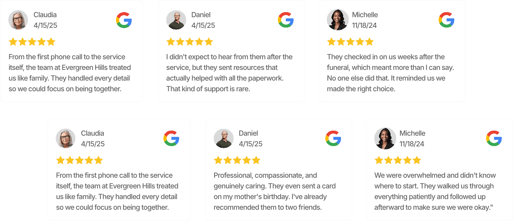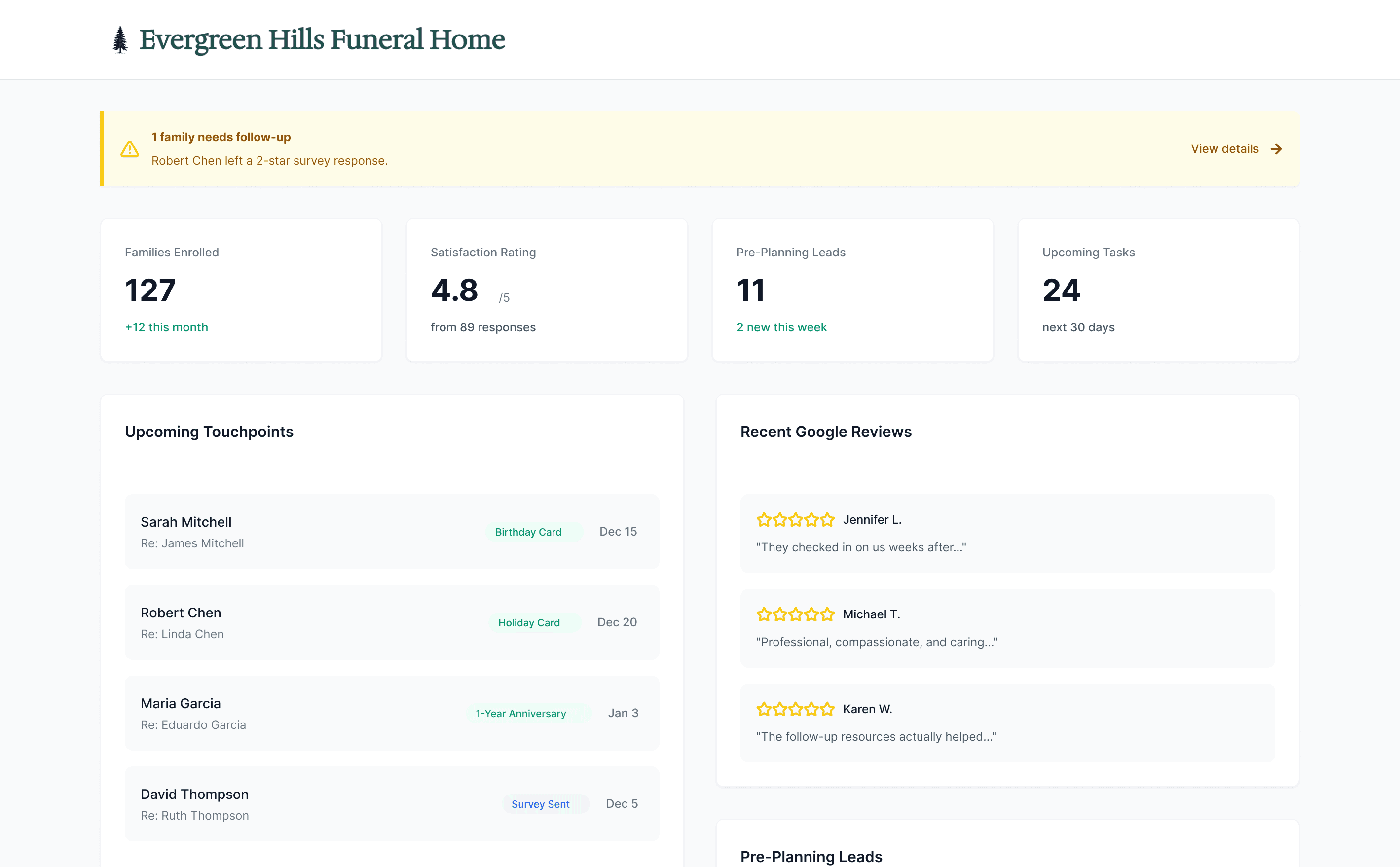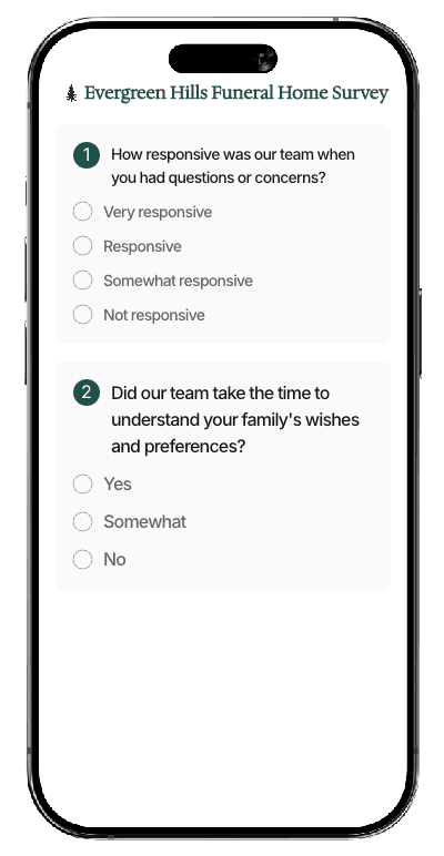 4 handwritten-feel cards. 4 personalized texts. Real resources for grieving families. Real time survey feedback. Google reviews on autopilot.