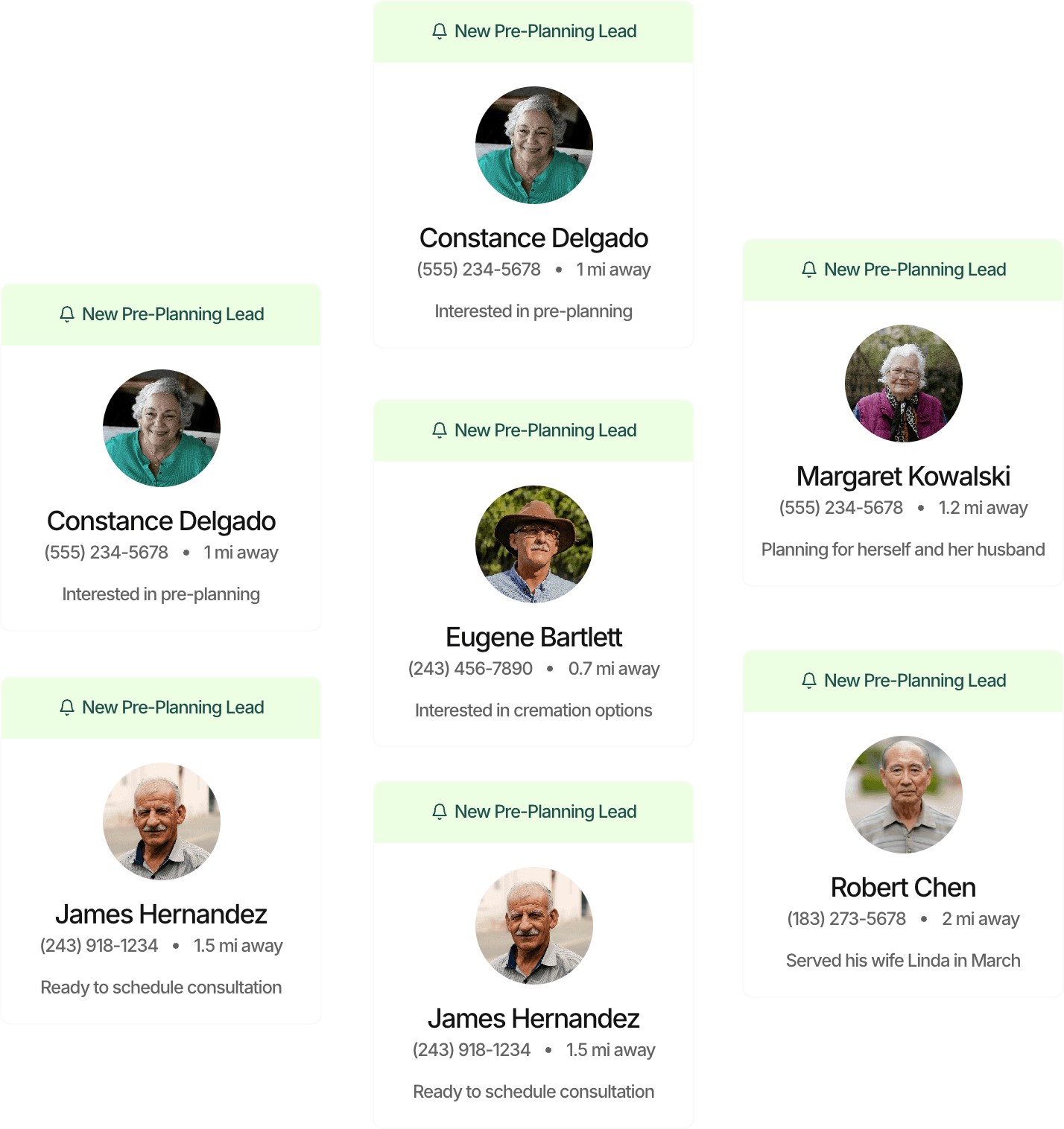 A text checks in and offers pre-planning information. Families who are interested are delivered to you as warm leads.