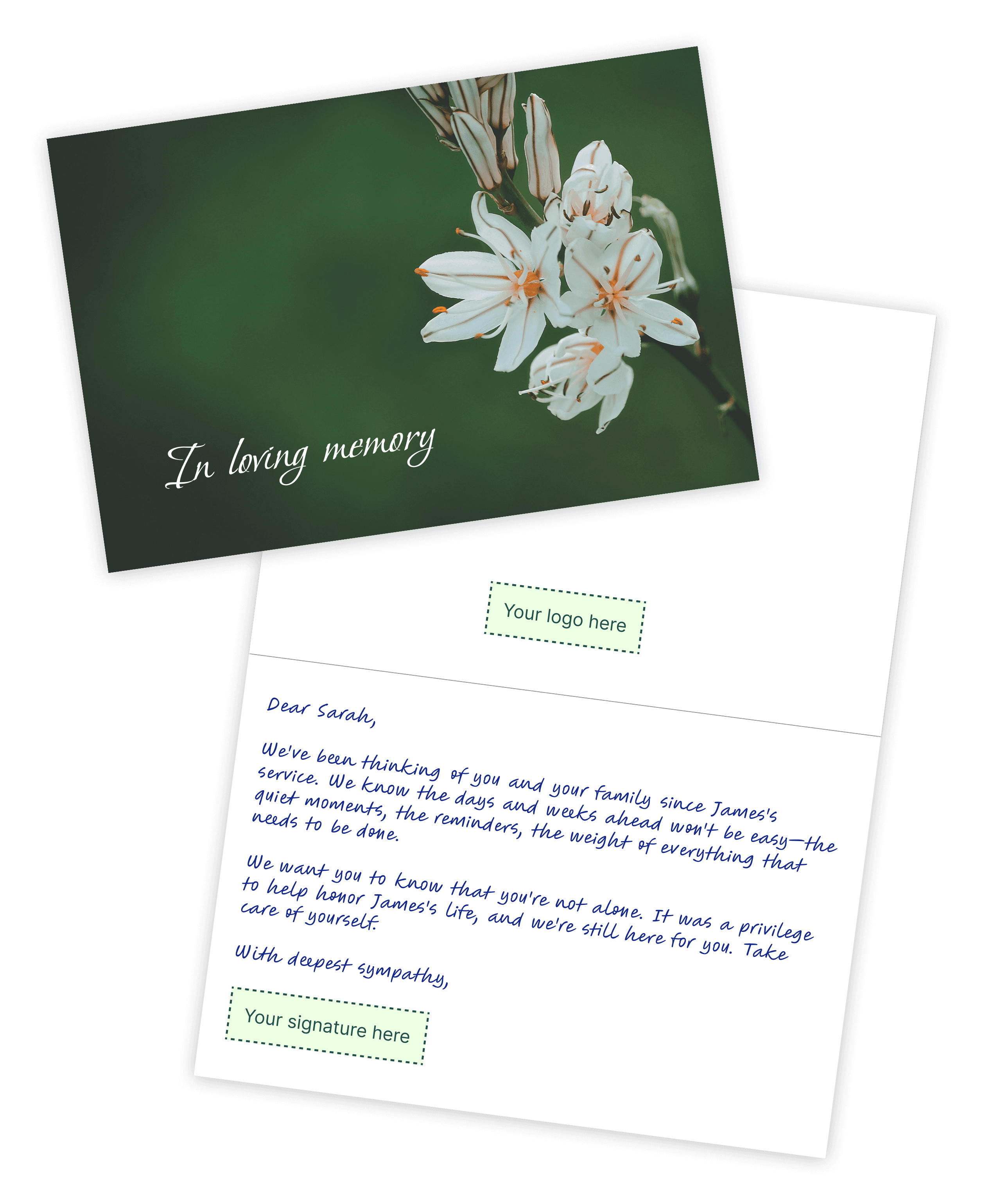 A heartfelt card arrives when the casseroles have stopped and the house has gone quiet. Your name. Your signature. A reminder that someone still cares.